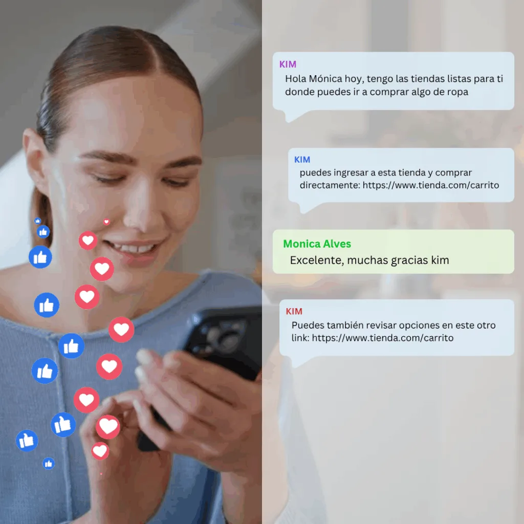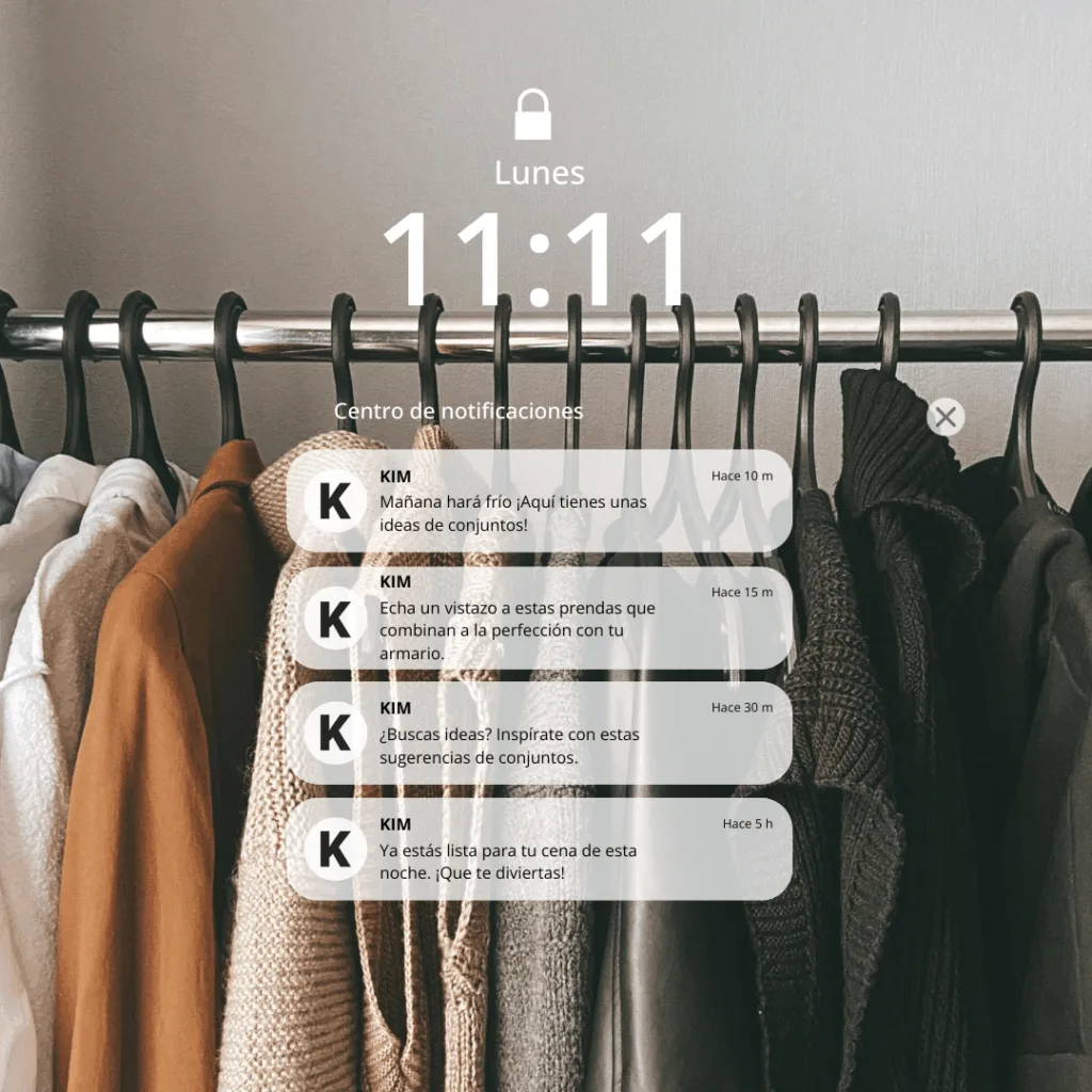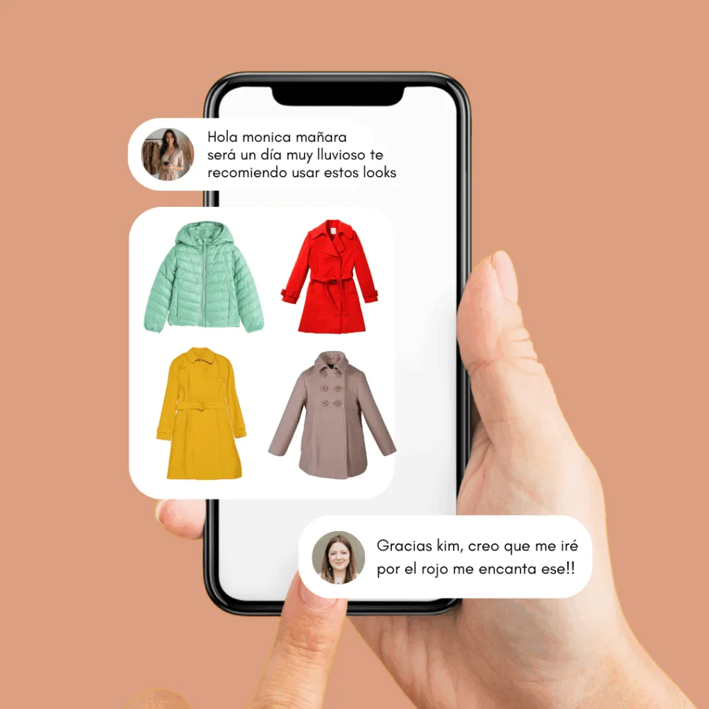 Chateas con KIM como si fuera una persona. Respondes preguntas, compartes fotos de tu estilo, y la IA analiza todo para darte sugerencias de looks, colorimetría y compras inteligentes. Todo pasa directo en WhatsApp, sin apps extra.