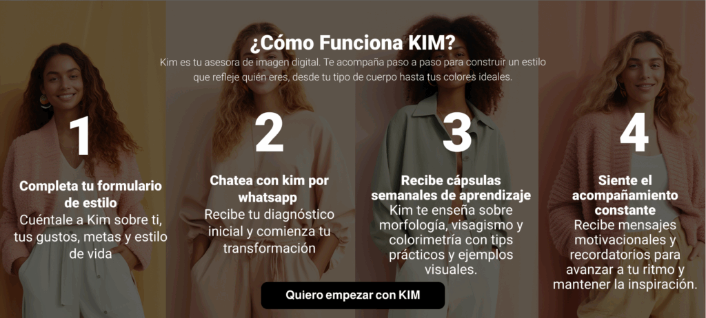 Es un servicio digital que combina experiencia en moda y tecnología. Una asesora como KIM te entrevista, analiza tus fotos y hábitos, y con IA crea looks, tips y compras recomendadas en WhatsApp, de forma accesible y práctica.